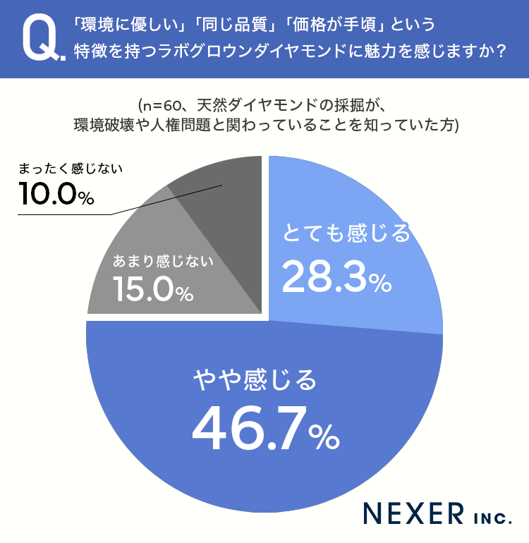 「やや感じる」が46.7%で最も多く、「とても感じる」が28.3%でした。合わせて75.0%の人がラボグロウンダイヤモンドに魅力を感じていることがわかりました。一方で「あまり感じない」が15.0%、「まったく感じない」が10.0%という結果です。