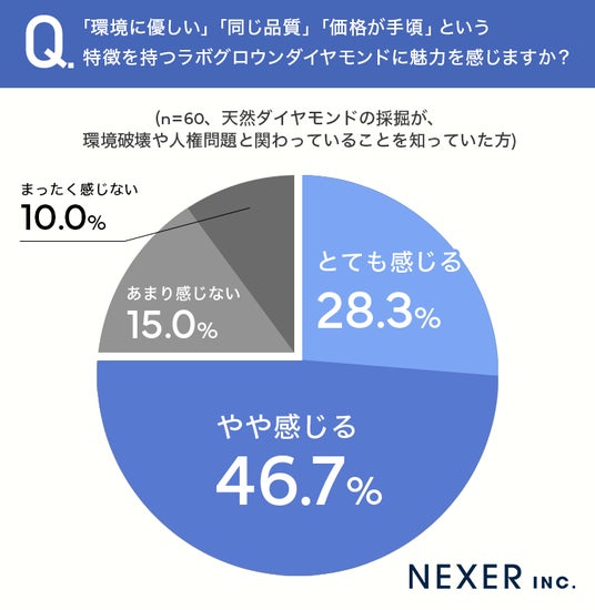 続いて、「環境に優しい」「同じ品質」「価格が手頃」という特徴を持つラボグロウンダイヤモンドに魅力を感じるかどうかを聞いてみました。