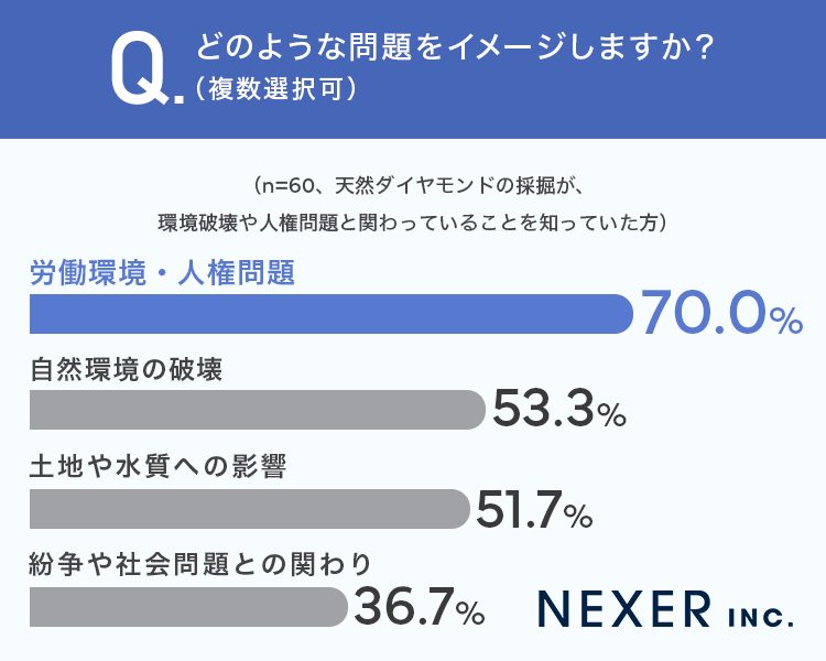 続いて、天然ダイヤモンドの採掘と環境破壊・人権問題の関わりを「知っていた」と回答した方に、どのような問題をイメージするかを聞いてみました。