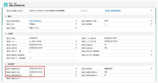 下図は管理画面で確認する超過勤務申請です。