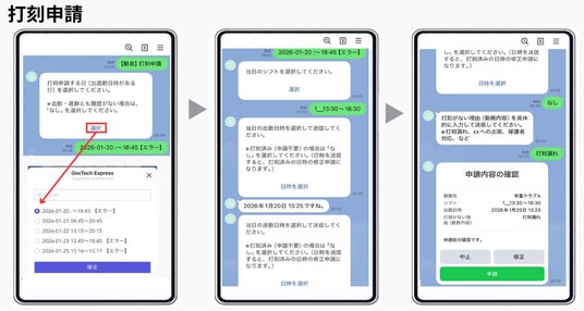 本機能では、施設に二次元コードを設置するだけで簡易的に勤怠管理システムを導入することが可能になります。職員の出退勤の打刻、休暇申請、超過勤務申請、打刻申請を、自治体のLINE公式アカウントで実現します。