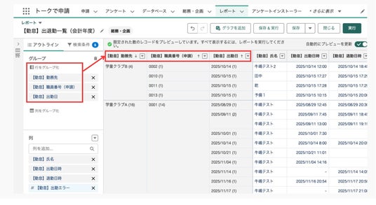 例えば「申請番号」をグループ化のトップにすると、職員ごとのレポートにグループ化されます。