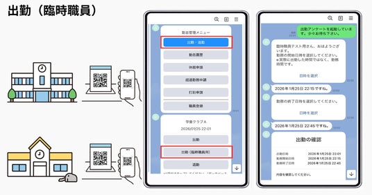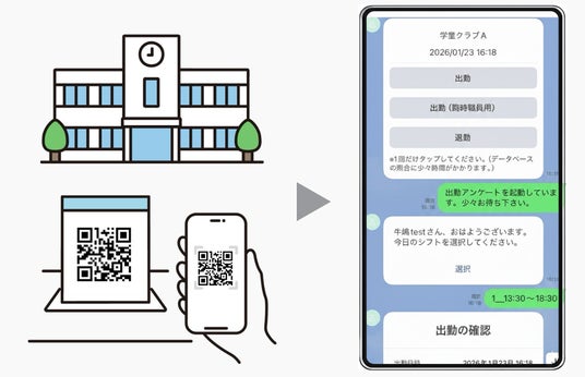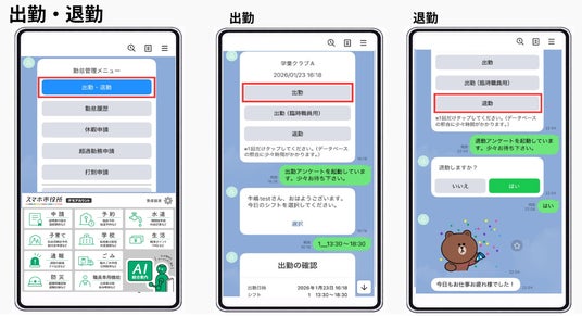 職員がカメラで二次元コードを読み取ると、読み取った「勤務先」と「読み取った日時」が記録され、出退勤のメニューがメッセージで届きます。メニューから「出勤」を選択すると、職員の登録情報と自動で照合されます。勤務シフトを選択すれば出勤打刻が完了します。