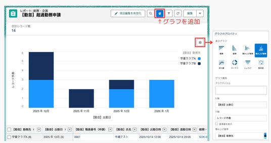 下図は、積み上げ縦棒を追加し、超過勤務申請数の月ごとの遷移を見える化したものです。