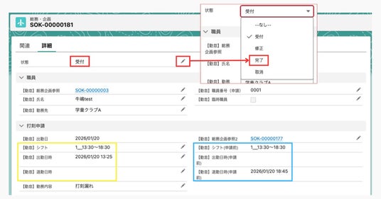 担当課が管理画面で申請内容(黄枠)と元の打刻状況(青枠)を確認し、「受付」を「完了」に変更して保存すると、元の出退勤の記録が修正されます。