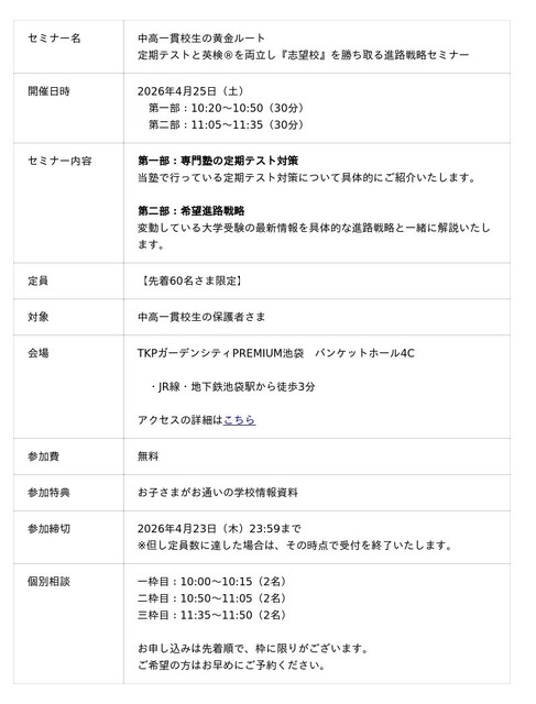 本セミナーでは、当塾の池袋周辺教室(池袋、南浦和、上野、駒込、石神井公園)で在籍が多い中高一貫校に通う生徒・保護者さまを主な対象に、専門塾ならではの定期テスト対策と、英検(R)活用を軸にした進路戦略をご紹介します。