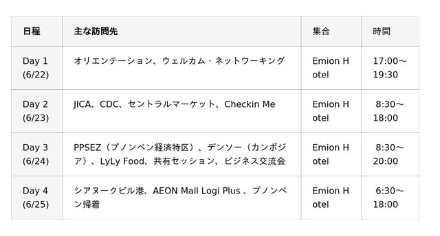- 現地ビジネスネットワークとの交流カンボジア企業の経営者やビジネス団体との交流を通じて、現地ビジネスコミュニティとのつながりを広げる機会となります。
