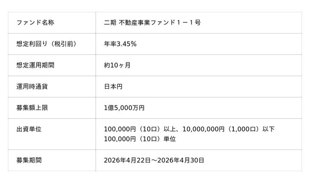 本ファンドは、投資家の皆様からの出資金を、『株式会社二期』に対し、販売用不動産購入資金として貸付け運用するファンドです。