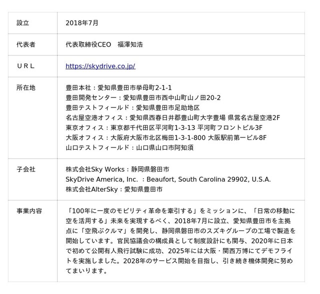 「空飛ぶクルマ」(※1)の開発・製造・販売を行う株式会社SkyDrive(本社:愛知県豊田市、代表取締役CEO 福澤知浩、以下「SkyDrive」)は、2026年4月下旬より東京都が主催する「SusHi Tech Tokyo 2026」および「Tokyo Mirai Weeks」の2つのイベントに出展することをお知らせいたします。なお、「SusHi Tech Tokyo 2026」においては、公式の注力領域(Focus on)である「Entertainment」分野の主要な展示として選出されました。