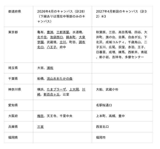 東京都内に24キャンパスを新設し、計38拠点へと拡大するほか、全国60拠点にキャンパス体制を拡充し、自宅から通いやすい「まなびのサードプレイス」として生徒の通学の利便性を大きく高めます。