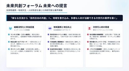 フォーラム後のアンケート結果から、回答者全員が「AIの積極利用」に賛同したことを踏まえ、単なるツール導入や知識共有に留まらず、『生成AI活用秘伝書 2026』を中心とした階層別伴走型ワークショップの開催や、現場主導による横断的組織「AI戦略チーム」の本格的稼働を進めます。会員各社は、事務処理のAIへの委譲を通じて、人的資源を顧客信頼構築など人間特有の付加価値活動へ集中させ、組織の経営力強化を推進します。