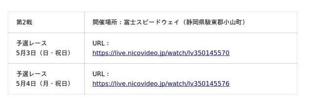 ニコニコでの生配信は、ネット配信視聴チケット制で、1戦ごとのチケットのほか、3種類の通し券から選んで購入できます。前売券・当日券のどちらでも予選と決勝の両レースを楽しめます。チケットは、4月17日(金)15時より、ドワンゴチケット(https://dwango-ticket.jp/project/0RVgGbhjea)にて販売します。