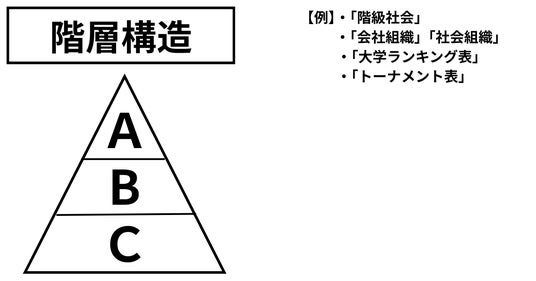 「階層構造(ヒエラルキー)」…わかりやすくいうと「ピラミッド構造」。時間軸に沿ってずらすと「ホップ>ステップ>ジャンプ」の「ステップアップ構造」になります。