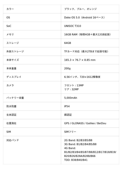 Android 16ベースの独自OS「Doke OS 5.0」を搭載し、最大16GB RAM(拡張含む)や5,000mAhバッテリー、6.56インチディスプレイなど、日常使いに求められる機能をバランスよく備えたエントリーモデルです。