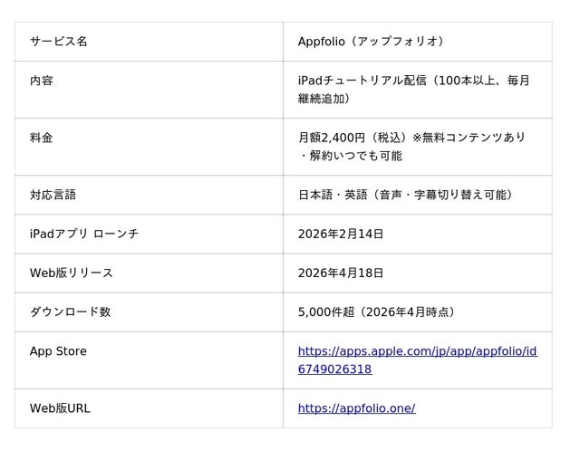 株式会社olio(代表:垣田 彩水、所在地:京都府)は、iPadのチュートリアルアプリ「Appfolio(アップフォリオ)」の本格展開を、2026年4月18日より開始します。