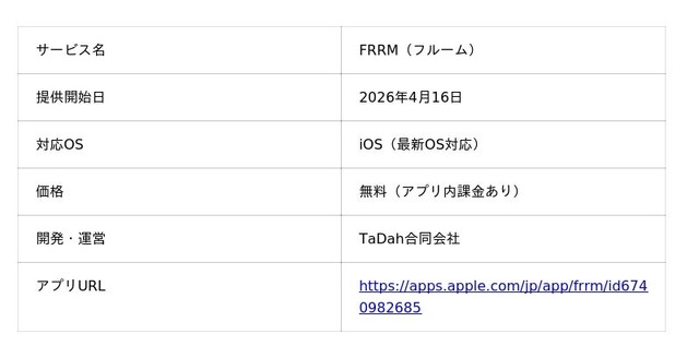 広告を中心としたコミュニケーションアイデアの研究・開発・実装を行うTaDah合同会社(所在地:東京都中央区)は、2026年4月20日に友情管理アプリ「FRRM(フルーム)」をリリースしました。FRRMは、大切な友達との思い出や気持ちを記録し、関係を継続的に育んでいくためのアプリです。