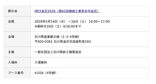 株式会社テクノア(本社:岐阜県岐阜市、代表取締役:山崎 耕治)は、5月14日~16日に 石川県産業展示館(1・3・4号館) で開催される「MEX金沢2026(第62回機械工業見本市金沢)」に出展いたします。