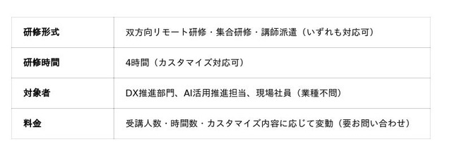 「金融業界のセールス向け」「製造現場の進捗管理向け」など、貴社の実業務をテーマにした演習内容への変更が可能です。時間数の調整や、複数研修との組み合わせによる体系的なAI人材育成プランのご提案も承っています。