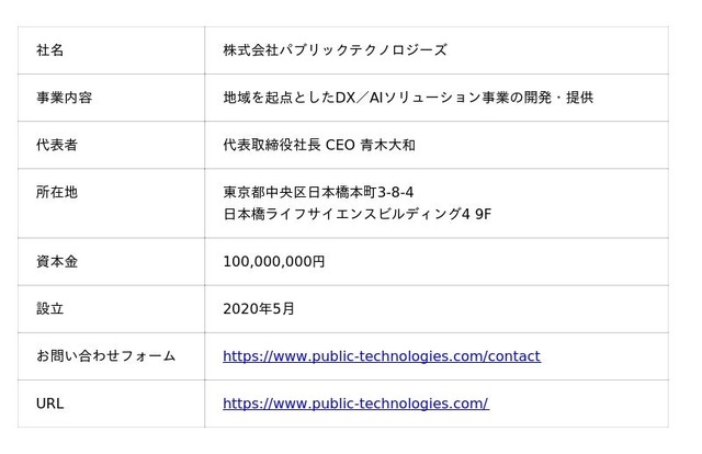 公共ライドシェアや地域通貨などを一つのアプリに集約した地方自治体向けスーパーアプリ「パブテク」(https://pubtech.jp/)をはじめ、行政業務に特化したデータベースとプロンプトレスAIを提供する「パブテクAI行政」(https://ai-gov.pubtech.jp/)、地域企業の現場に入り込み、AIソリューションの実装・定着まで伴走する「パブテクAIビジネス」(https://ai-biz.pubtech.jp/)などを展開。