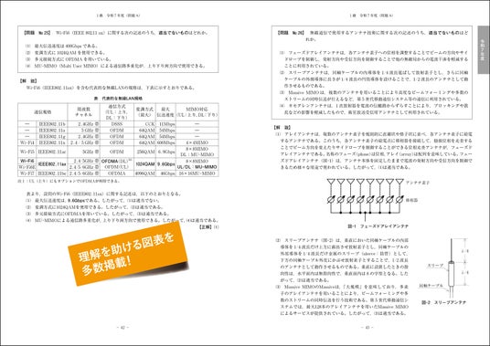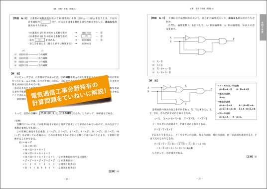 第一次検定はマークシート方式で、その大半は、4つの選択肢から「適当でないもの」や「誤っているもの」を選ぶ問題です。たとえば、「誤っているもの」を選ばせる問題の場合、正答肢以外の残りの選択肢はすべて正しい文章であり、そのまま知識として覚えておけば、1問解くごとにさまざまな知識が身につき、学習効率は通常の4~5倍にもなります。そのため、本書では正答肢とその理由を解説するだけでなく、正答肢以外の選択肢についても詳しく解説しています。また、電気通信工学の分野では、磁界の強さ、回路の抵抗値・電流、論理回路、進数変換など、計算を伴う問題が毎年出題されます。本書では、それらの問題について途中計算を含めたていねいな解説を掲載しています。