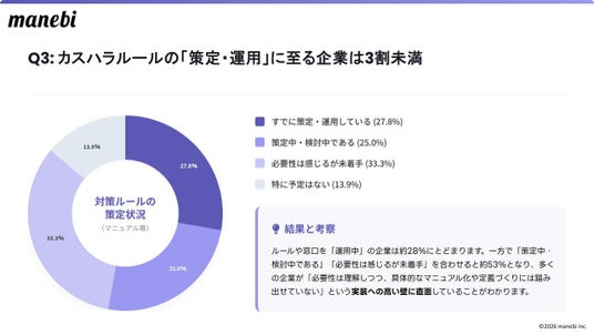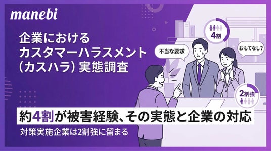 株式会社manebi(本社:東京都新宿区、代表取締役執行役員CEO:田島 智也)は、企業の人事・総務担当者等を対象に「カスタマーハラスメントに関する実態調査」を実施いたしました。
