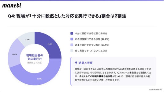 「あまり実行できていない(19.4%)」「全く実行できていない(11.1%)」と回答した企業も2割強存在しており、前述の「ルールの未整備」とも連動して、会社としての明確な基準や後ろ盾がないため、個人の判断で対応することの難しさが表れています。