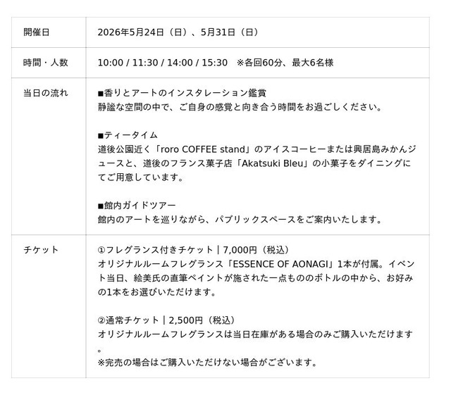 「旅の目的地となる宿(=デスティネーションホテル)」をプロデュースする株式会社温故知新が運営する、「瀬戸内リトリート 青凪 by 温故知新」(所在地:愛媛県松山市、総支配人:下窪 日登美)は、香りとアートのインスタレーション「The Fragrance of Art」を、2026年5月24日(日)・31日(日)に開催いたします。