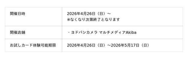 この販売開始を記念し、ヨドバシカメラ マルチメディアAkiba2026年4月26日(日)にて実演販売、お試しカード無料配布などのイベントを実施いたします。