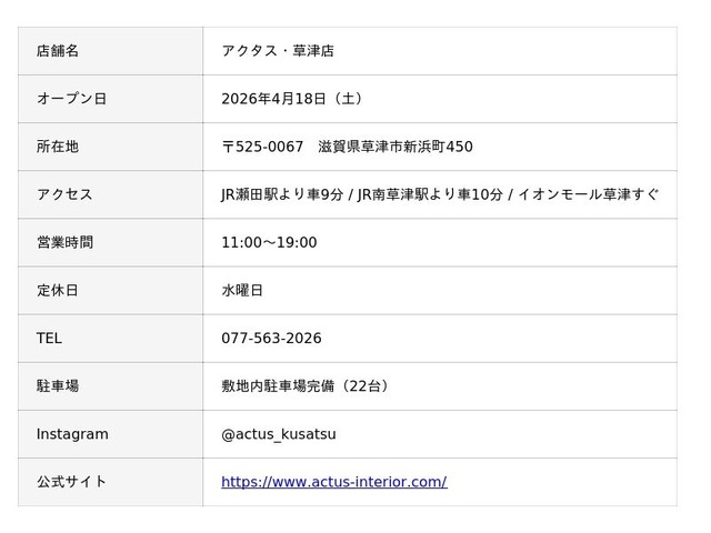 株式会社グランレブリー(本社:京都府京都市西京区、代表取締役:河村 広貴)は、北欧・ヨーロッパ家具を中心としたライフスタイルショップ「ACTUS(アクタス)」のライセンスショップとして「アクタス・草津店」を2026年4月18日(土)にグランドオープンいたします。
