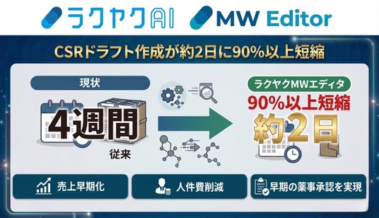 株式会社メタリアル(本社:東京都千代田区、代表取締役:五石順一)グループで、国内市場No.1※のAI翻訳サービス及び製薬ドキュメント専門AI「ラクヤクAI」を開発・提供する株式会社ロゼッタ(代表取締役:五石 順一)は、治験総括報告書(CSR)のドラフト作成業務において、メディカルライティングの豊富な経験を持つ社内専門家による検証の結果、従来約4週間を要していた作成期間を約2日に短縮し、90%以上の工数削減を確認しましたことをお知らせいたします。