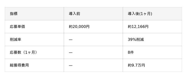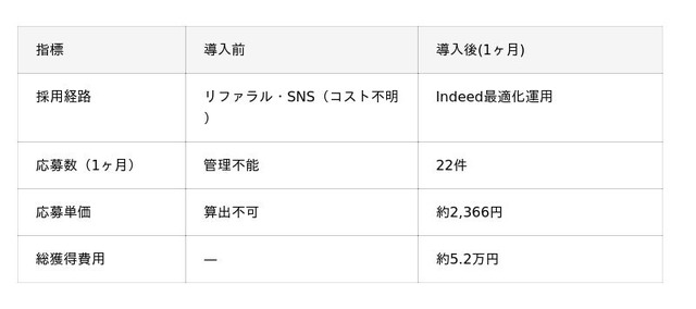 切り替え初月で22件・応募単価2,366円を達成。採用コストの「見える化」により、経営判断に使えるデータ基盤が構築された点も大きな成果です。