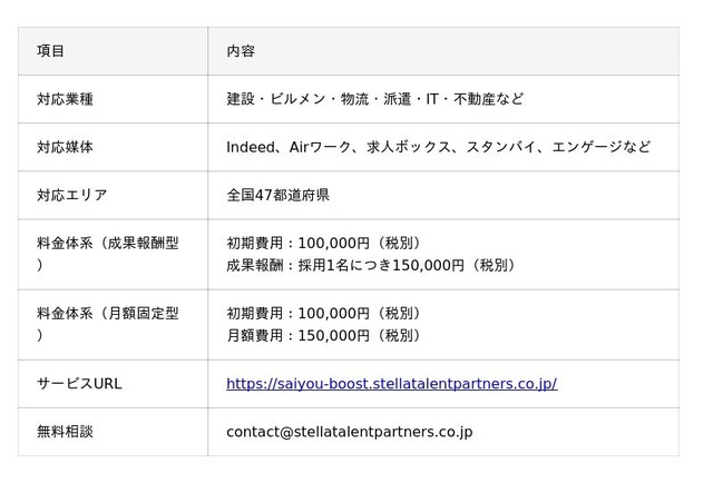 - Stella Talent Partners株式会社(採用ブースト) - RPOに特化した領域特化型。物流・施工・派遣・ドライバー・IT・不動産など人手不足業界への特化ノウハウを提供。成果報酬型・月額固定型の2プラン。累計350社以上の運用実績。詳細は公式サイト参照
