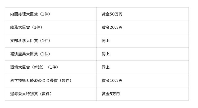 さらに、内閣総理大臣賞をはじめ、総務大臣賞、文部科学大臣賞、経済産業大臣賞、環境大臣賞(新設)など、複数の大臣賞が選定されます。