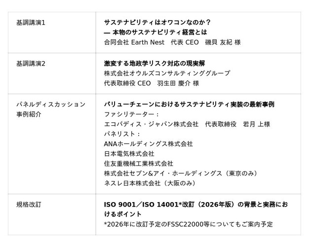 本イベントでは、「外部環境の急激な変化・環境課題への対応と企業のバリューチェーン戦略 ~成熟する規格とAI活用~」をテーマに、サステナビリティ経営や地政学リスク、データ連携・AI活用など、企業が直面する重要課題について議論するとともに、おもにISO 9001/ISO 14001(2026年版)等2026年に予定されている規格改訂の要点と実務への影響を解説いたします。