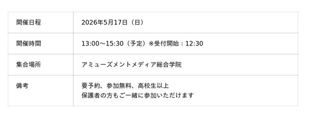 声優という職業への理解を深めるとともに、進路選択の参考としてご参加いただける機会です。