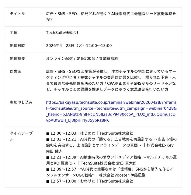 TechSuite株式会社(テックスイート/COO バクヤスAI事業統括 倉田 真太郎)は、2026年4月28日(火)にTechSuite株式会社が主催するオンラインウェビナー「広告・SNS・SEO…結局どれが効く?AI検索時代に最適なリード獲得戦略を探す 」に登壇します。