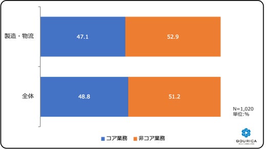 製造・物流業界に限定すると、コア業務は47.1%と全体を1.7ポイント下回り、非コア業務は52.9%とやや高い水準でした。差は1~2ポイント程度と大きくはないものの、製造・物流ではコア業務に充てられる割合がやや少なく、非コア業務の比重が高い傾向が見て取れます。いずれの業界でも非コア業務が過半を占めており、コア業務に集中できる時間は半分程度にとどまっています。