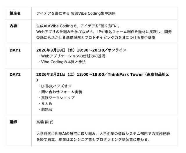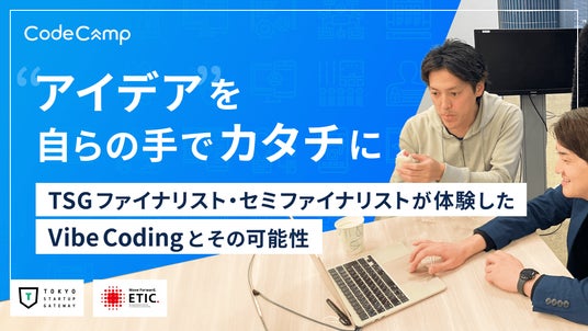 コードキャンプ株式会社(本社:東京都品川区、以下 CodeCamp)は、東京都主催、NPO法人ETIC.が運営事務局を担うスタートアップビジネスコンテスト「TOKYO STARTUP GATEWAY(以下、TSG)」のセミファイナリスト・ファイナリスト向けに、生成AIを活用したWeb開発手法「Vibe Coding」を学ぶ「アイデアを形にする 実践Vibe Coding集中講座」を2026年3月、オンラインと対面の2日間にわたり開催しました。