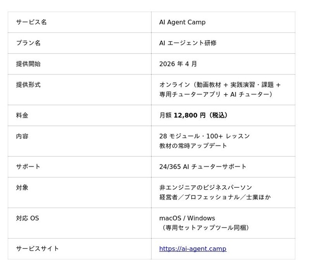 コンセプトは「AI エージェントの力を、あなたの手に」 実践的な AI エージェント研修を通じて、業務効率化の新しいスキルを段階的に習得できるよう、28 モジュール・100+ レッスン、専用チューターアプリ/セットアップツール、24/365 AI チューターサポート を同梱。月額 12,800 円(税込) で全モジュールを受講可能、教材は常時アップデートされます。サービスサイトは https://ai-agent.camp から。