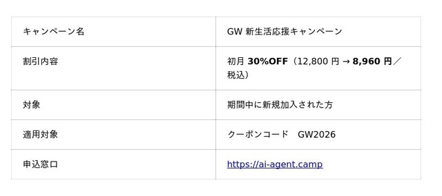 ゴールデンウィーク期間中の新規加入者を対象に、初月の受講料を 30%OFF(12,800 円 → 8,960 円/税込)でご提供します。"新年度・新体制で AI を同僚に迎える" ための期間限定キャンペーンです。