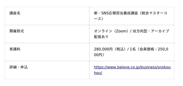 株式会社be.love.company.(本社:兵庫県神戸市、代表取締役:西 良旺子)は、「広報と研修で企業の付加価値を高める」を使命に、人材育成研修とSNS広報コンサルティングで中小企業をサポートしています。創業20周年の節目となる2026年、2014年より続けてきた「SNS広報担当養成講座」を大幅リニューアル。「新・SNS広報担当養成講座 統合マスターコース」として2026年6月17日(水)よりオンライン(Zoom)にて開講いたします。開講から10年以上・60期にわたり、中小企業の「自走できるSNS広報人材育成」を目的として支援し続けてきた本講座が、時代の変化に対応してさらに進化します。