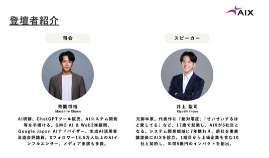 株式会社AIXでは、企業ごとの業務に最適化した専用AIエージェントの設計・開発・導入を支援しており、構想にとどまらない“実装型”のAI導入支援を強みとしています。今回の登壇では、そうした支援実績を背景に、AI活用を企業の実務成果へとつなげるための考え方を発信しました。