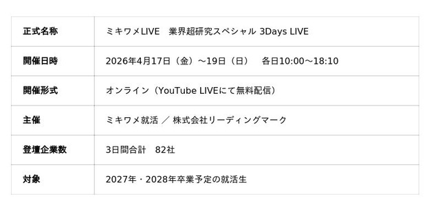Personality Techを通じたHR事業「ミキワメAI」「ミキワメ就活」を提供する株式会社リーディングマーク(本社:東京都港区、代表取締役社長:飯田 悠司、以下「リーディングマーク」)は、2026年4月17日(金)~19日(日)の3日間、YouTube配信形式のオンライン合同説明会「ミキワメLIVE 業界超研究スペシャル 3Days LIVE」を開催しました。各業界を代表する82社が登壇し、事前申込者数は延べ約1万5,000名超、来場者数は延べ8,000名超を記録。企業満足度は平均4.45点(5点満点)と、参加企業・学生双方から高い評価を得ました。