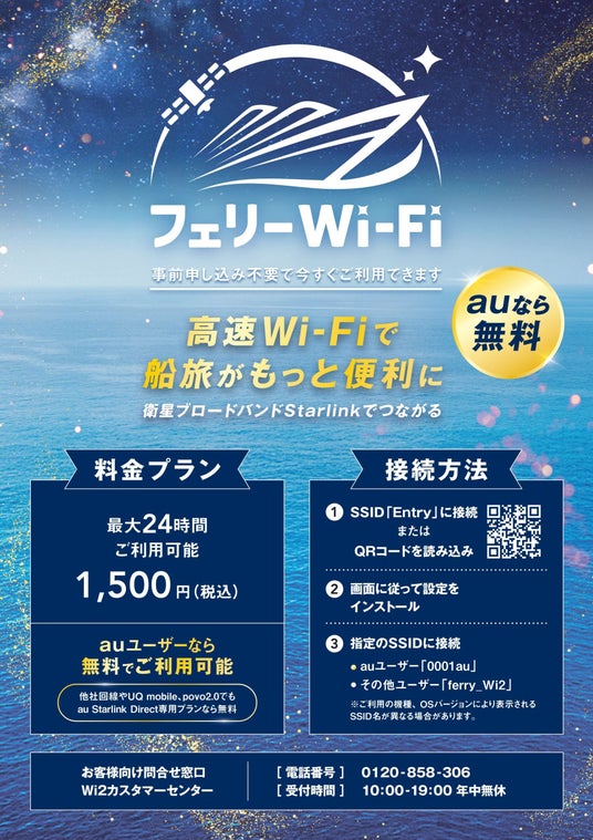 ※「au Starlink フェリーWi-Fi」はKDDI株式会社・株式会社ワイヤ・アンド・ワイヤレスが提供するサービスです。本サービスをご利用の場合は、お客さまとKDDI株式会社・株式会社ワイヤ・アンド・ワイヤレスとの直接のご契約となります。