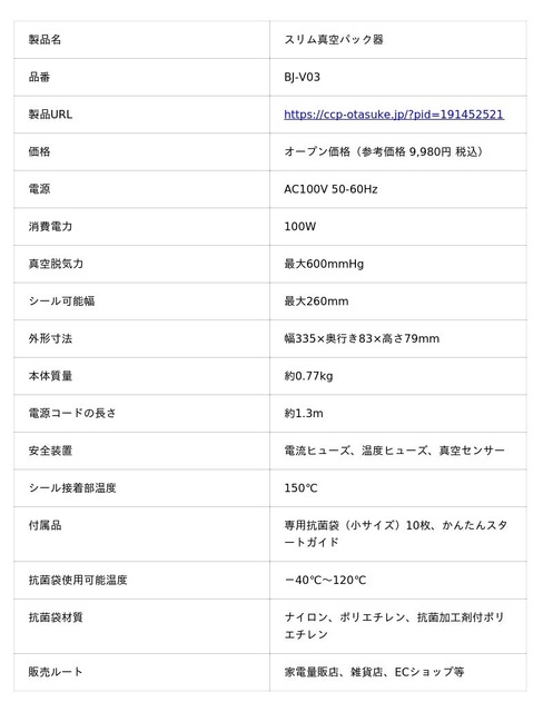 ・コンパクト設計:横幅 約33.5cm、奥行き・高さ約8cmのスリムデザイン・簡単操作:鮮度を長持ちさせる真空パックがボタン1つで簡単に完成