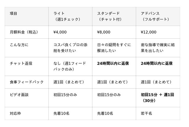 「一人では続かない。でもパーソナル指導は高すぎる」--多くのユーザーが抱えるこのジレンマに対して、記録と指導の仕組みを一体化することで、手の届く価格でプロの伴走を受けられる選択肢を提供します。しかも、普段の記録がそのまま専門家に共有されるため、追加の報告や入力は不要です。