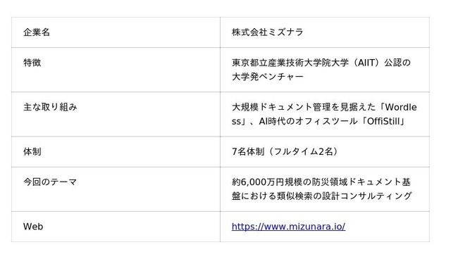 日本最大級の自治体における防災ドキュメント基盤 ── 約6,000万円規模・3年契約の案件で、数千ページの文書に対する「類似検索」をどの技術で実現すべきか。専任アーキテクトを雇うほどではない、でも社内だけでは決め切れない。この隙間を埋める形で、株式会社ミズナラは Leach 生成AI顧問を活用しました。CTO 小田 将之 様、CEO 木下 祐馬 様にお話を伺います。