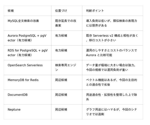 - 7候補→1案:MySQL全文検索/Aurora PostgreSQL+pgVectorなど、コスト・運用負荷・要件適合で比較
