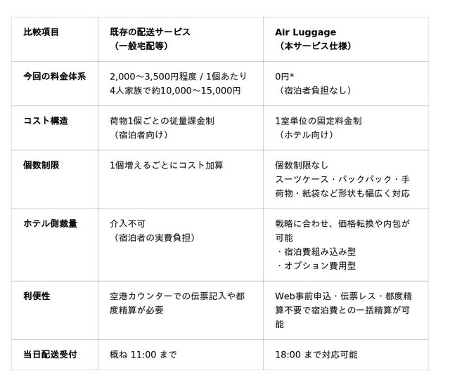 本サービスは、従来の「荷物1個単位」の従量課金ではなく、「1室単位の固定料金(個数無制限)」というB2Bモデルを採用しています。これにより、各施設は自社のブランド戦略に合わせた自由な提供形態を選択可能です。