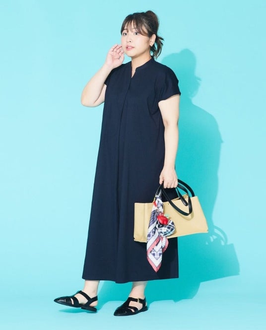 1枚で決まるネイビーワンピースは、吸水速乾と接触冷感機能付きで暑い日も快適。さらっとした着心地で、デイリーからお出かけまで幅広く活躍します。スカーフにチャームを重ねたバッグで彩りを添え、軽快な大人カジュアルスタイルに。